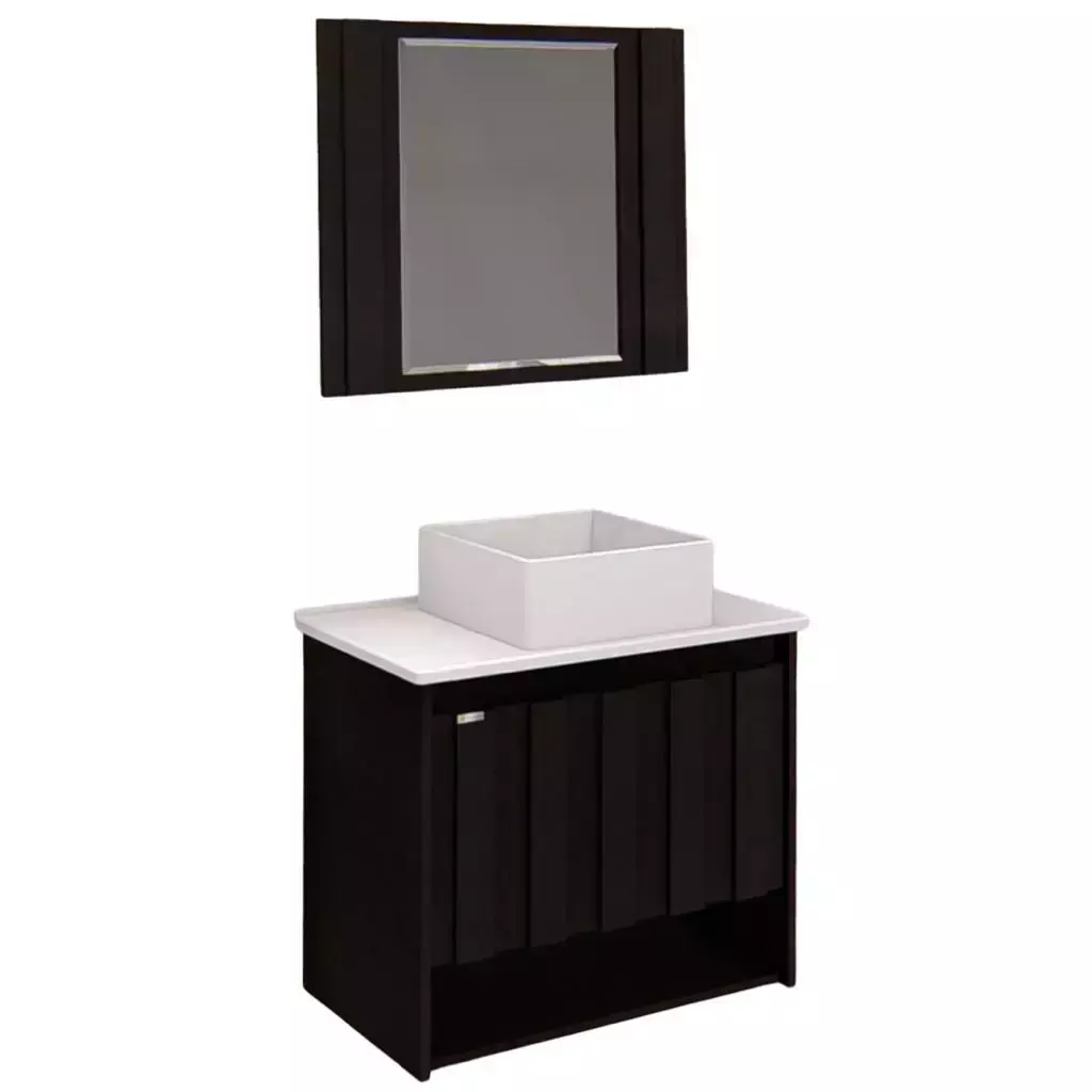 Com 63 cm de largura, o modelo conta com cuba embutida em mármore sintético e uma espelheira elegante que amplia a sensação de espaço. Ideal para ambientes compactos ou médios, o conjunto é entregue praticamente montado – basta fixar na parede e instalar os puxadores.